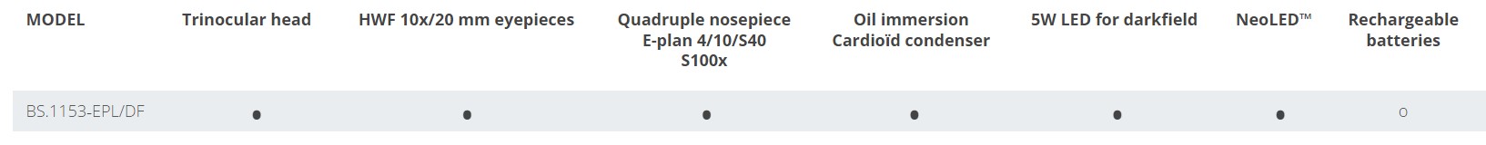 - Được cung cấp kèm với một ống kính tập trung hiện đại được trang bị gương phản xạ kiểu lược thể phản xạ, kết hợp với nguồn sáng LED công suất cao 5 W tích hợp. Cùng với ống kính S100x có ống định hình màng mắt tích hợp, đây tạo thành một giải pháp hiệu ứng sáng tối phóng đại 1000x. Nguồn cung cấp của nguồn sáng LED công suất 5 W được tích hợp trong kính hiển vi.