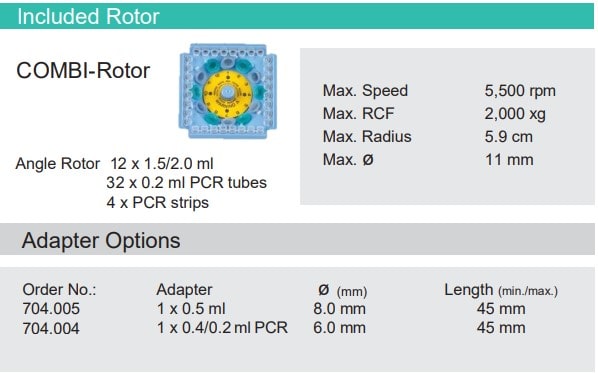 Khác với các máy li tâm mini truyền thống, mẫu Z 130 M không cần thay rotor khi chuyển đổi giữa các ống nhỏ và dải PCR. COMBI-Rotor độc đáo đi kèm là tất cả những gì cần thiết để chạy 12 ống nhỏ. Với tốc độ cố định tạo ra 5.500 vòng/phút, máy li tâm này hoàn hảo cho các phép quay nhanh.