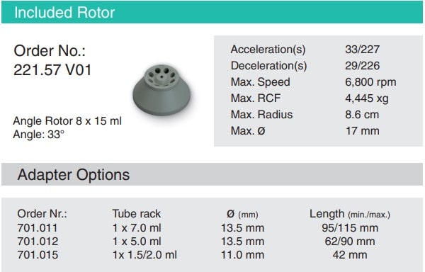 100 - 230 V / 50 - 60 Hz - Đã bao gồm rotor 8 x 15 ml.