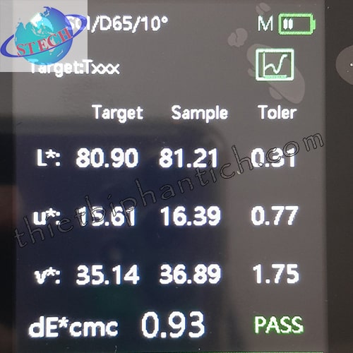 | Không gian màu và các chỉ số | Reflectance, CIE-Lab, CIE-LCh, Hunter Lab, CIE-Luv, XYZ, Yxy, RGB, Công thức sai khác màu (ΔE*ab, ΔE*cmc, ΔE*94, ΔE*00), Whiteness Index (ASTM E313-00, ASTM E313-73, CIE/ISO, AATCC, Hunter, Taube Berger Stensby), Yellowness Index (ASTM D1925, ASTM E313-00, ASTM E313-73), Blackness Index(My,dM), Staining Fastness, Color Fastness, Tint (ASTM E313-00), Color Density CMYK(A,T,E,M), Metamerism Index Milm, Munsell, Opacity, Color Strength | ||
